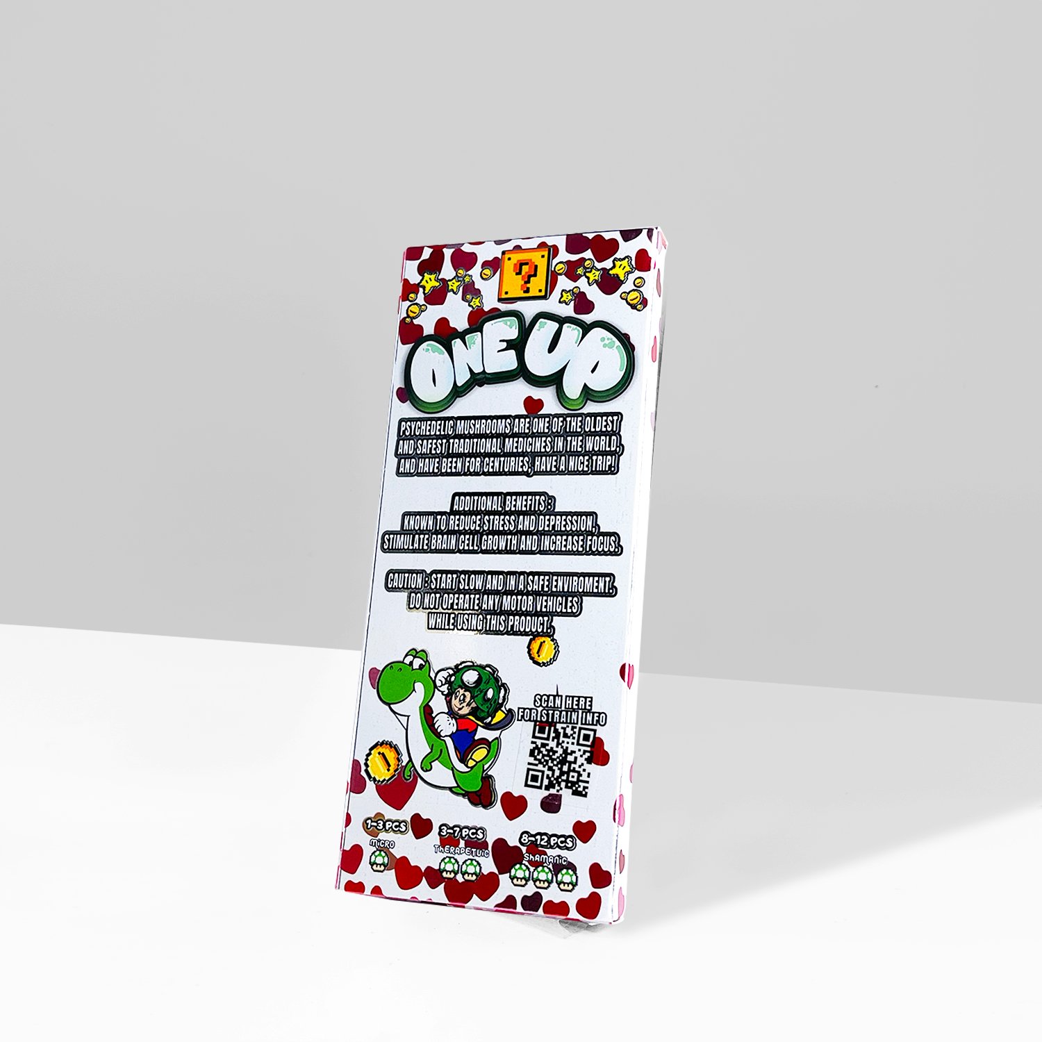 These tasty 1 up shroom Strawberry and cream white chocolate bars truly make you feel like your in Mario’s world, the high is clean AF and the method of absorption is tasty! There’s no longer a need to suffer while eating shrooms, just try our edible shrooms for the most pleasant experience.